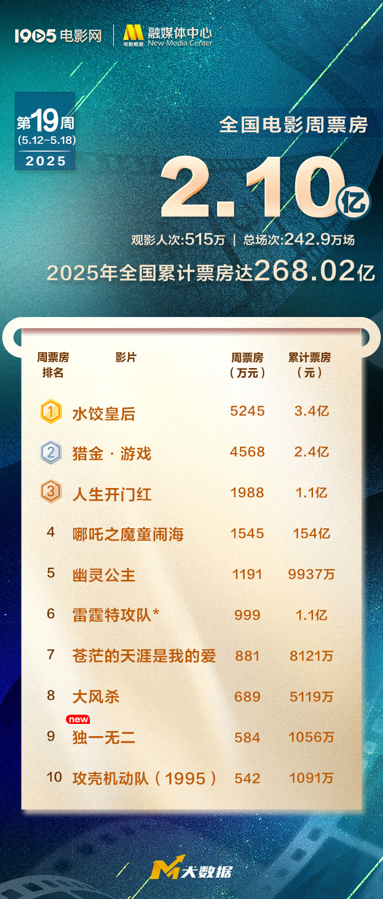 1905电影网讯 2025年第19周(5.12-5.18)全国电影周票房2.10亿元,观影人次超515万,2025全年电影票房累计268.02亿元。